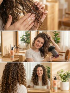 Bóp nhẹ gel lên tóc theo khuôn xoăn mong muốn, có thể để khô tự nhiên hoặc sấy nhẹ để giữ nếp đẹp hơn.
